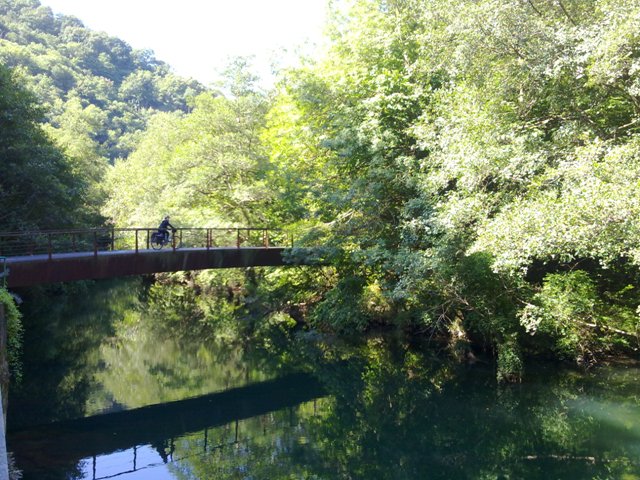 Atravesamos el río Trubia por un bonito puente de madera para empezar a pedalear por la Senda del Oso, remontando el encajonado río dirección Villanueva, pueblo al que llegamos tras 5 Km y que abandonamos cruzando su característico puente romano.